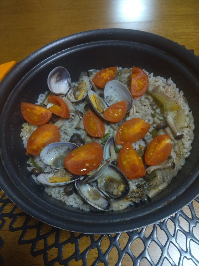 イカ エビ アサリ ホタテ 鶏 玉葱 シメジ ミニトマト ピーマン しrワイン ニンニク レモン