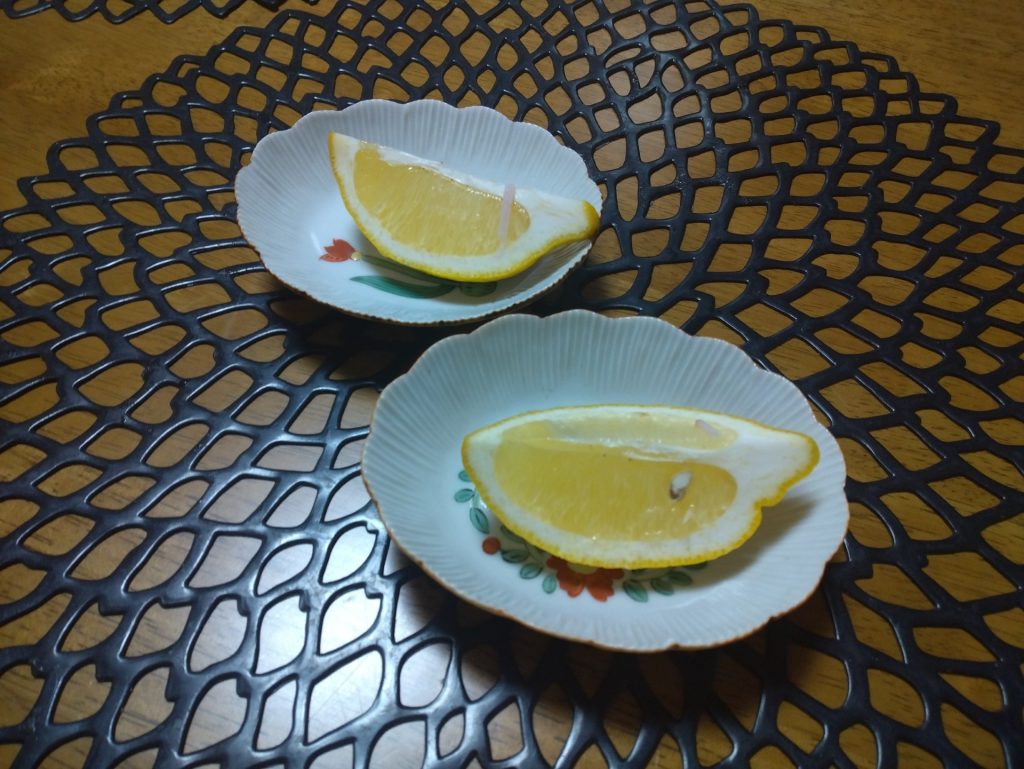 今晩のパエリアで使うレモンを盛りつけてみました。